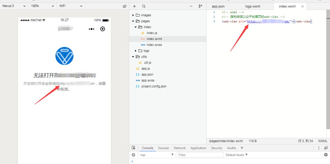 在微信公众平台后台的开发设置中设置你所想要打开的域名。