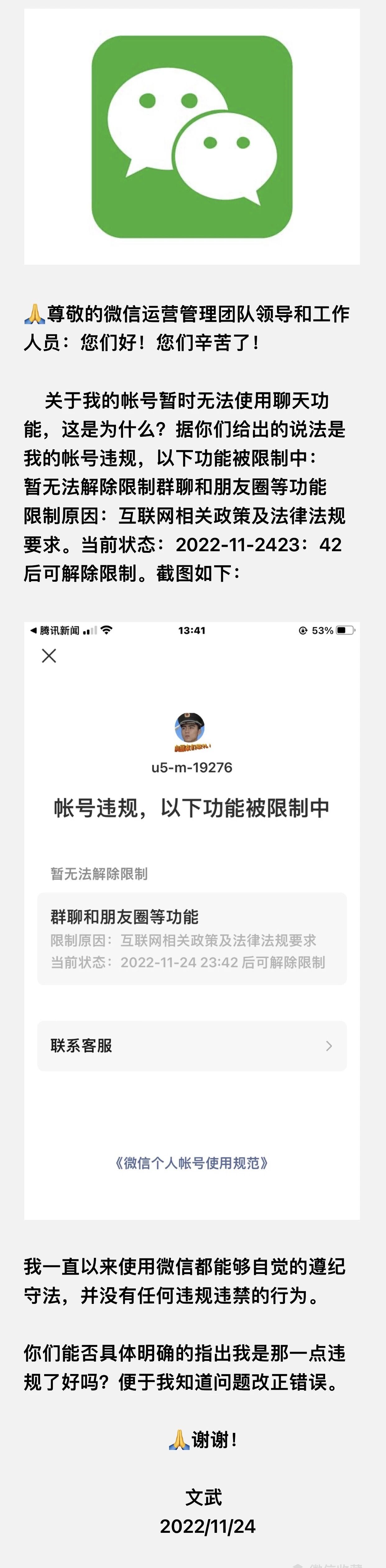 🙏尊敬的微信运营管理团队领导和工作人员:您们好!您们辛苦了! 关于我的帐号暂时无法使用聊天功能,这是为什么?据你们给岀的说法是我的帐号违规,以下功能被限制中: 暂无法解除限制群聊和朋友圈等功能 限制原因:互联网相关政策及法律法规要求。当前状态:2022-