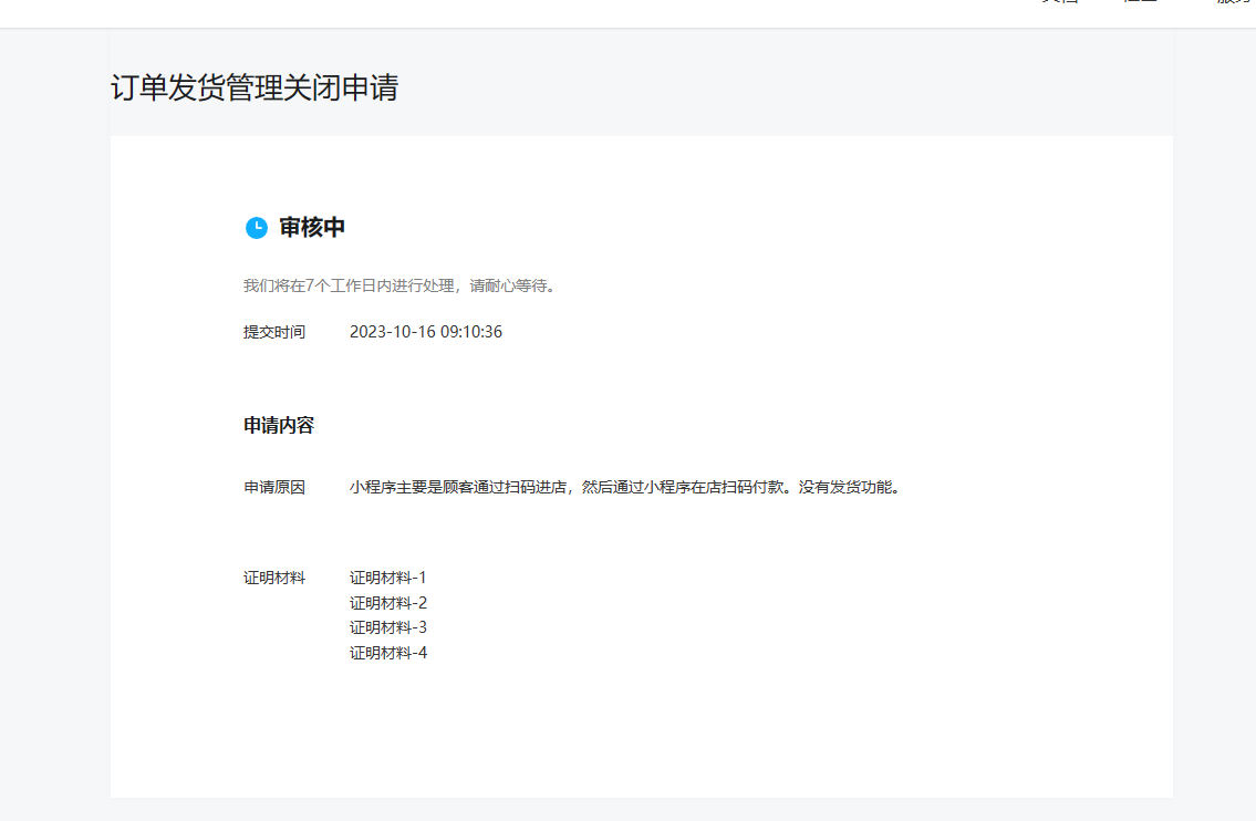 小程序功能是线下购物,不需要发货,10月16日申请的关闭,到现在还在审核中。