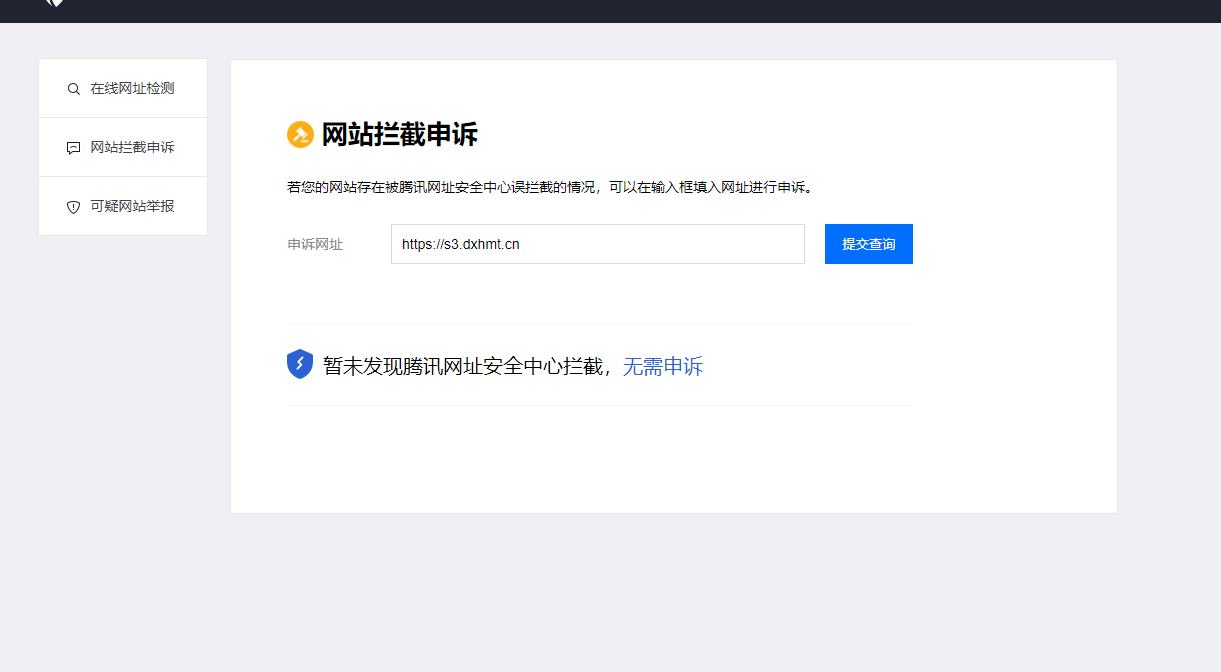 然后我们去腾讯安全-网址安全中心检测和申诉,检测结果为"暂未发现风险",申诉结果为“暂未发现腾讯网址安全中心拦截,无需申诉”。