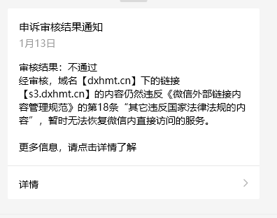 你好,经审核,域名【s3.dxhmt.cn】下的违规内容已经修改,现已恢复微信内直接访问的服务,请知悉。详细规则请参考《微信外部链接内容管理规范》http://weixin.qq.com/cgi-bin/readtemplate?t=weixin_external_links_content_management_specification