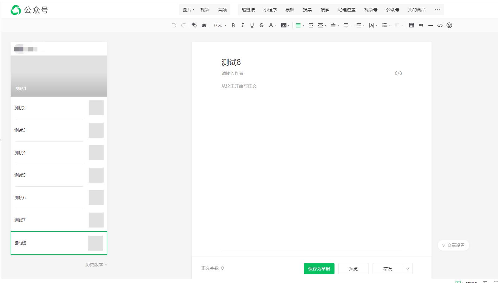 编辑界面左侧有文章增减导航条,以前是有一个滚动条的,当文章超过5条时,用滚动条下翻查看其它标题或下翻使用“新建图文”按钮。目前滚动条功能消失了,且左侧导航栏悬不能下翻,看不到第6-8条编辑信息,也无法使用“新建图文”按钮(目前我都只是靠浏览器缩放功能,把页面缩小到80%来使用)