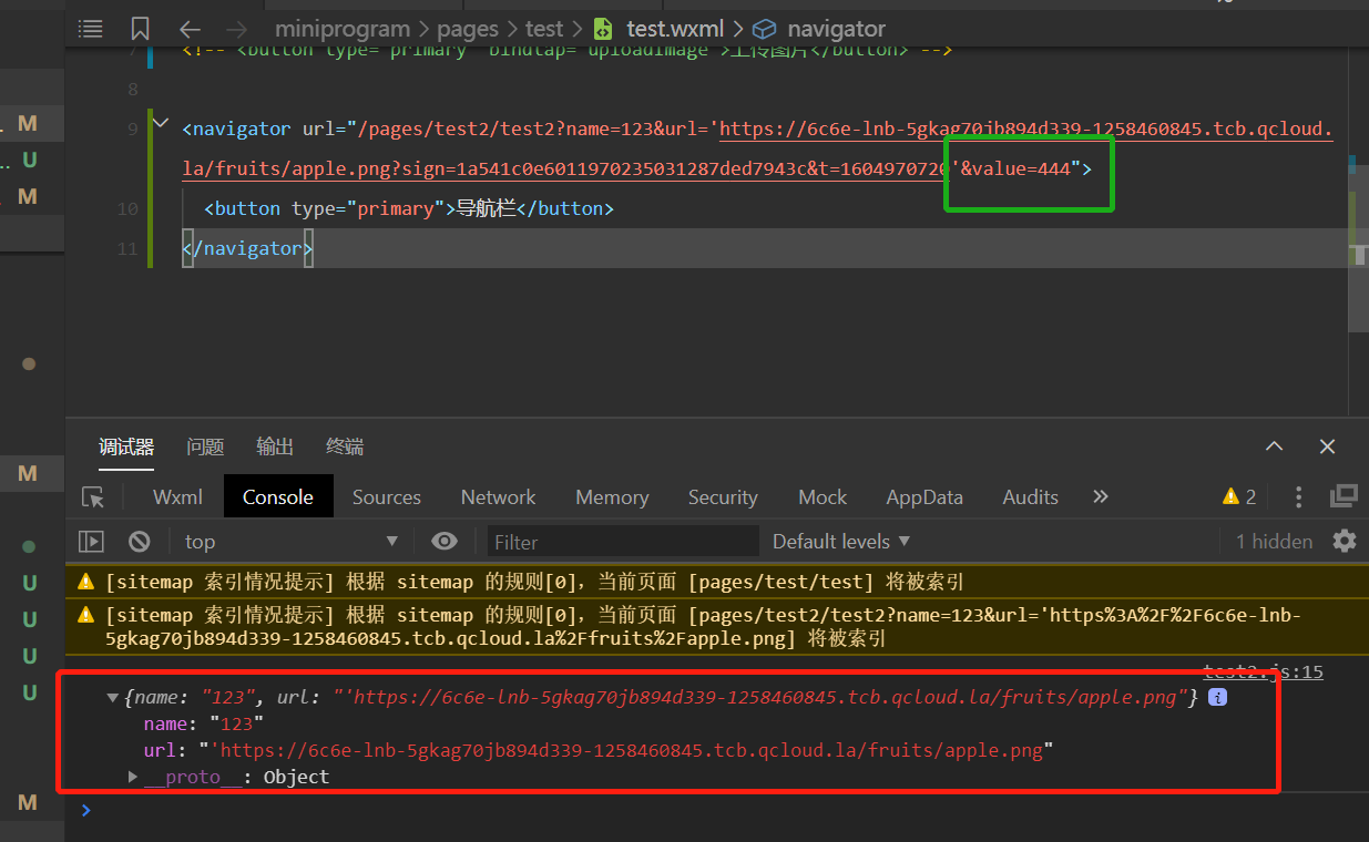 <navigator url="/pages/test2/test2?name=123&url='https://6c6e-lnb-5gkag70jb894d339-1258460845.tcb.qcloud.la/fruits/apple.png?sign=1a541c0e6011970235031287ded7943c&t=1604970720'&value=444">