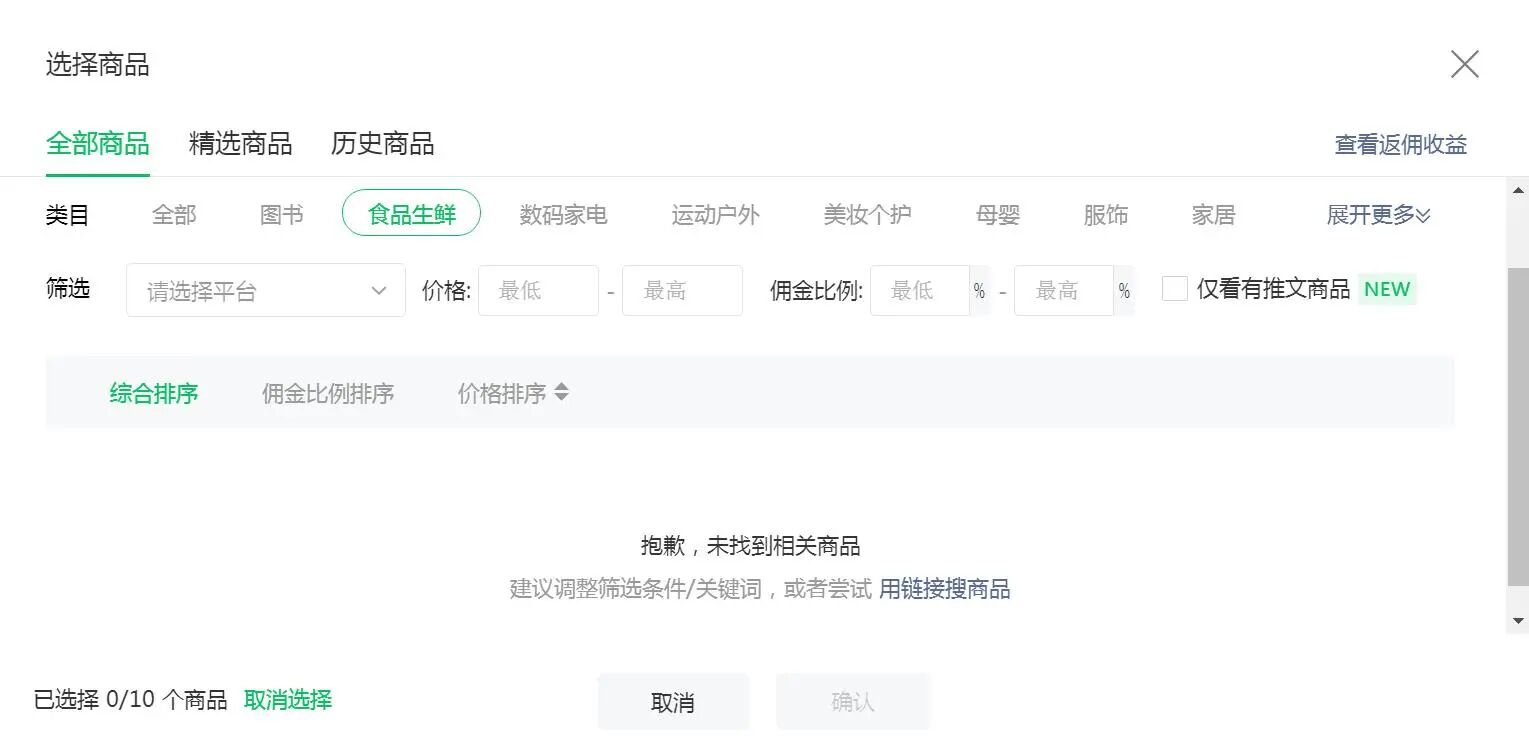 最近两天点开返佣商品选择目录全部商品各类目都没列表内容,只能选择精品商品或历史商品,是什么回事?