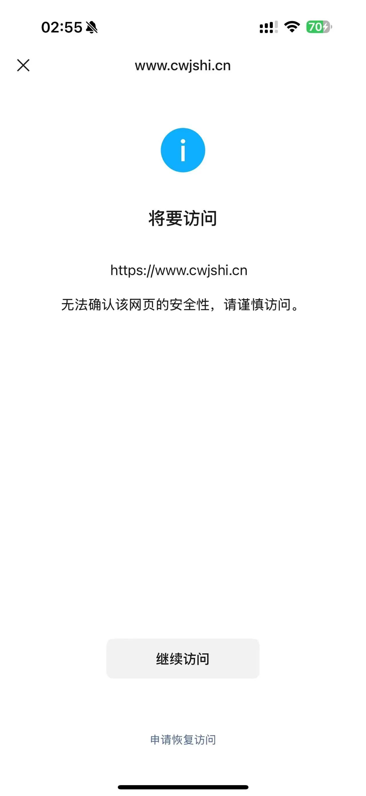 微信内访问网站出现“无法确认该网页的安全性,请谨慎访问”的拦截提示,网站是我们公司网站,主要内容更新一些新产品信息,以及工厂动态文章,我们也多次申诉,一直没有得到结果。