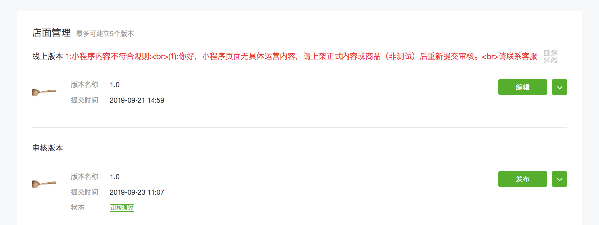 你好,这个精品店商品全部上架完毕了,提交审核显示通过,点发布之后显示 1:小程序内容不符合规则:<br>(1):你好,小程序页面无具体运营内容,请上架正式内容或商品(非测试)后重新提交审核。<br>请联系客服