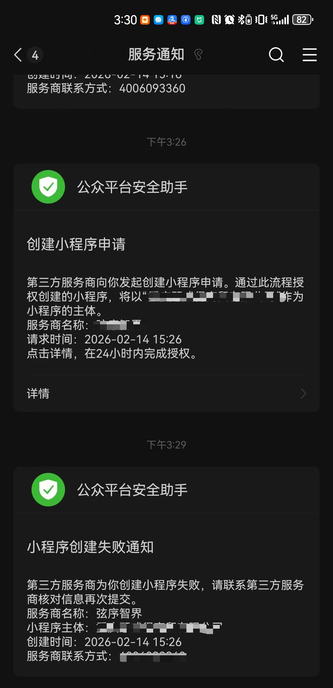 我们是第三方开发平台,之前都一直可以的(2月10日都有创建成功的小程序),今天发送注册邀请一切注册,但是商户填写资料后提示创建失败。我们也没收到任何回调通知,重新获取授权的列表也没有。只是商户手机上收到这个。