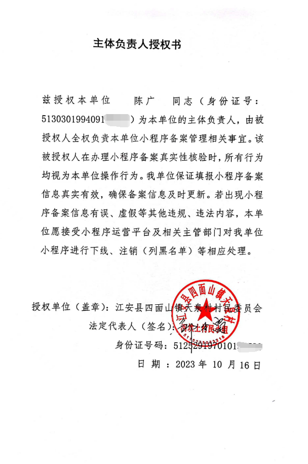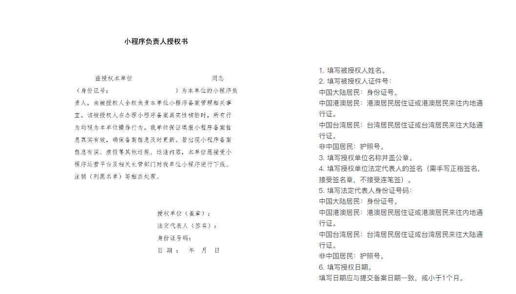 小程序负责人授权书,模板请参考:https://developers.weixin.qq.com/miniprogram/product/record/record_material.html#_1-%E6%99%AE%E9%80%82%E7%89%88%E5%B0%8F%E7%A8%8B%E5%BA%8F%E8%B4%9F%E8%B4%A3%E4%BA%BA%E6%8E%88%E6%9D%83%E4%B9%A6