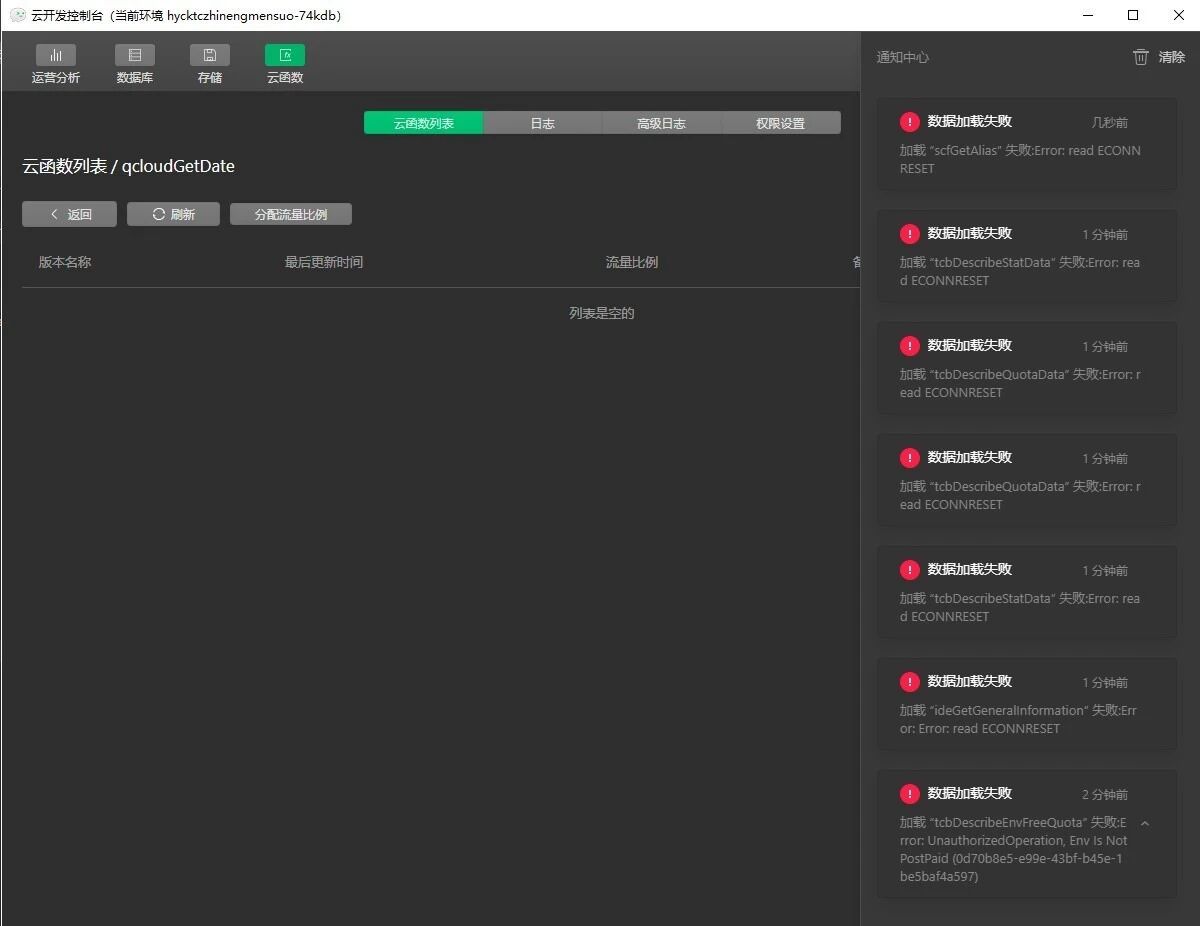 昨天下午开始的,上传云函数百分之90是上传失败的,提示是 Error: read ECONNRESET,再后来,发现连左上角云开发的入口点进去也打不开了,或者打开了,里面的各种请求都出错,是什么原因导致的呢?