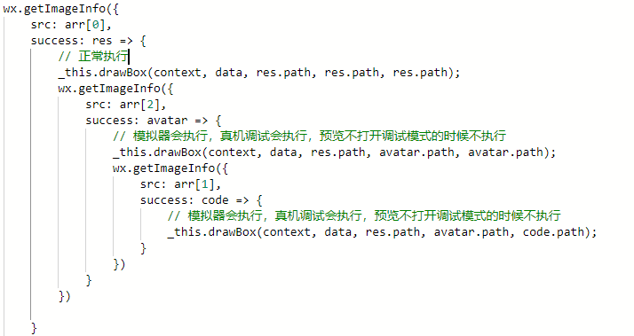 drawImg () { var _this = this const path1 = this.pageBg const path2 = this.QRCode const ctx = wx.createCanvasContext('shareCanvas') const QRSize = 120 wx.getImageInfo({ src: path1, success: function (res) { ctx.drawImage(res.path, 0, 0, 345, 588) } }) wx.getImageInfo({ src: path2, success: function (res) { ctx.drawImage(res.path, (345 - QRSize) / 2, 400, QRSize, QRSize) } }) ctx.draw(true, setTimeout(() => { wx.canvasToTempFilePath({ x: 0, y: 0, width: 345, height: 588, destWidth: 345, destHeight: 588, canvasId: 'shareCanvas', success: function (res) { console.log(res.tempFilePath) _this.finalImgUrl = res.tempFilePath }, fail: res => { console.log(res) } }) }, 2000)) }, |