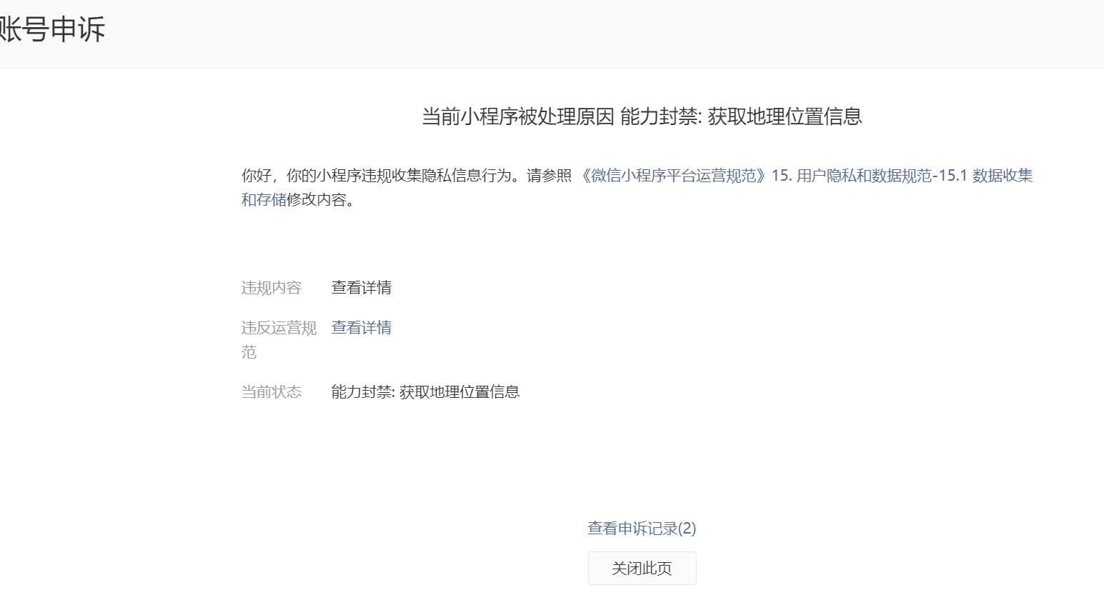 获取地理位置信息被封禁,无法运营,已经按要求修改了代码并发起申诉2次都没过,麻烦问下官方大大,这个接口永久不能使用了吗?要是真的封禁了我们公司开展的活动就废了啊,在线求官方指引~