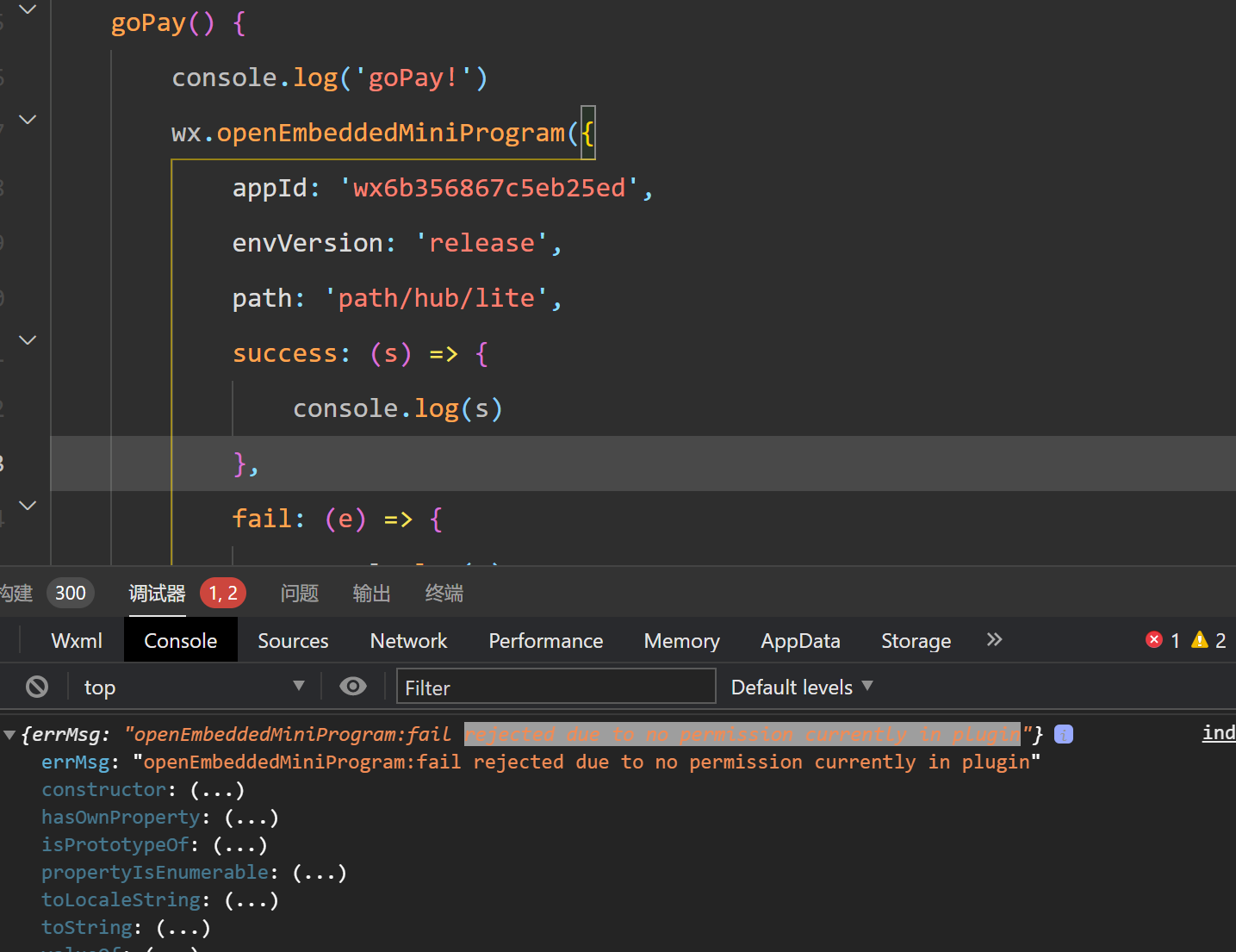 openEmbeddedMiniProgram:fail rejected due to no permission currently in plugin