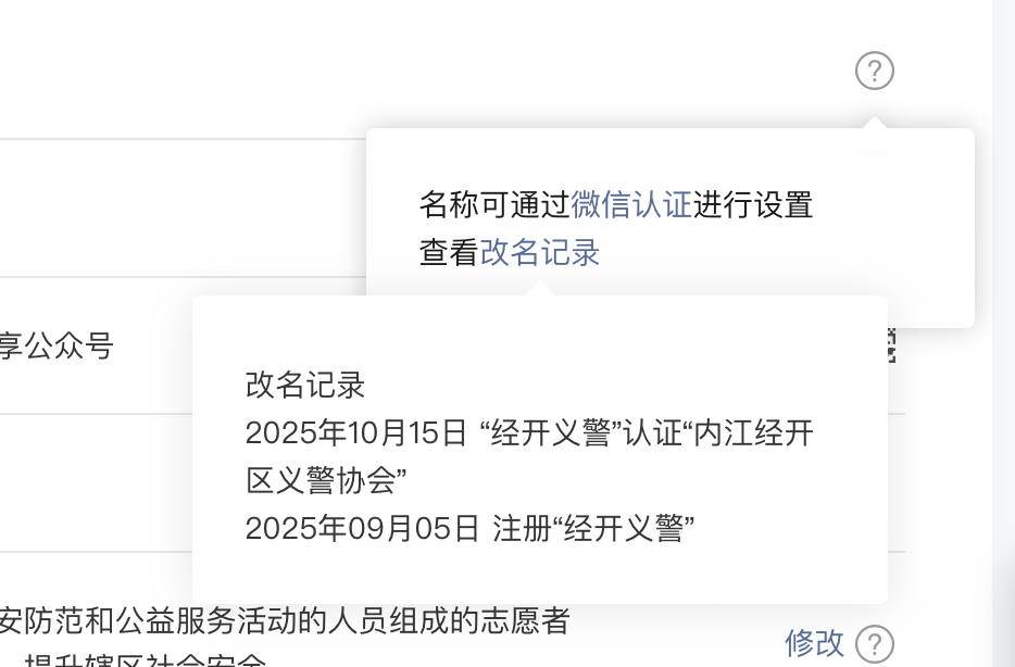 原本我们的公众号名称【经开义警】,昨天认证通过后自动强行更名为【内江经开区义警协会】,我没有要求和申请改公众号名字,为什么要给我修改,申请回调。