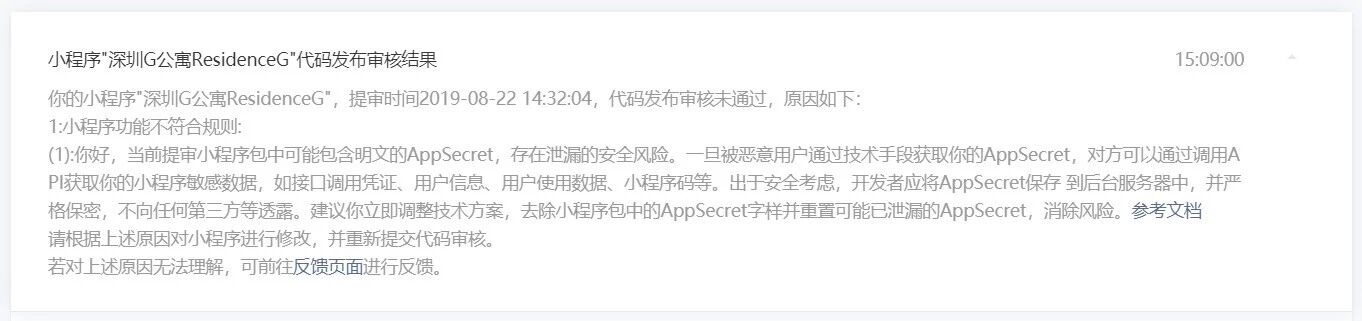 全文检索没有发现AppSecret,配置文件里有一个字段secret是公司内部用于校验API请求和商户的,不是小程序的AppSecret,也反馈了,但是三次都驳回了,都是上面这个理由,官方帮忙看看