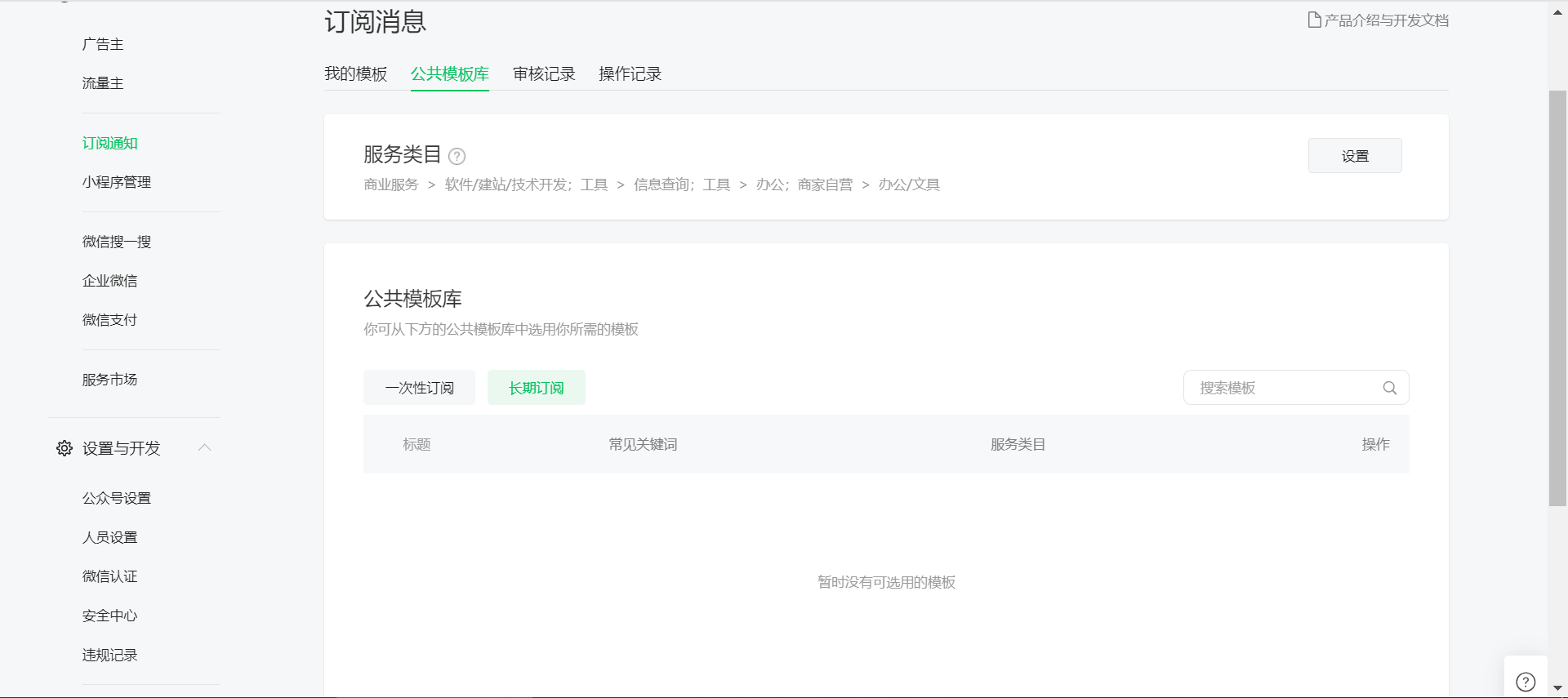 服务号的长期订阅功能下没有模版,请问怎么办?