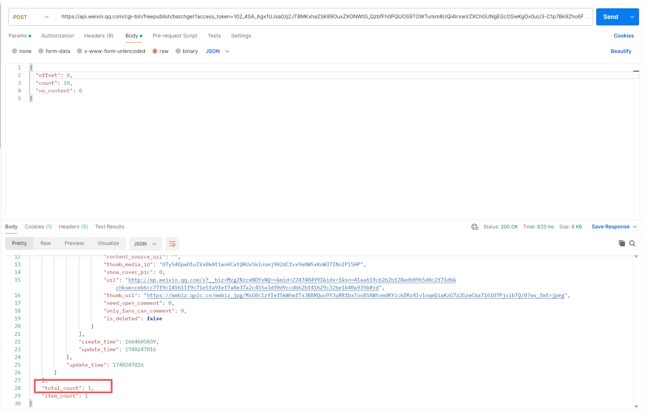 如图所示,我调用接口获取已发布文章列表,只返回了一条推文,但是我这个公众号最近都发布了很多推文。