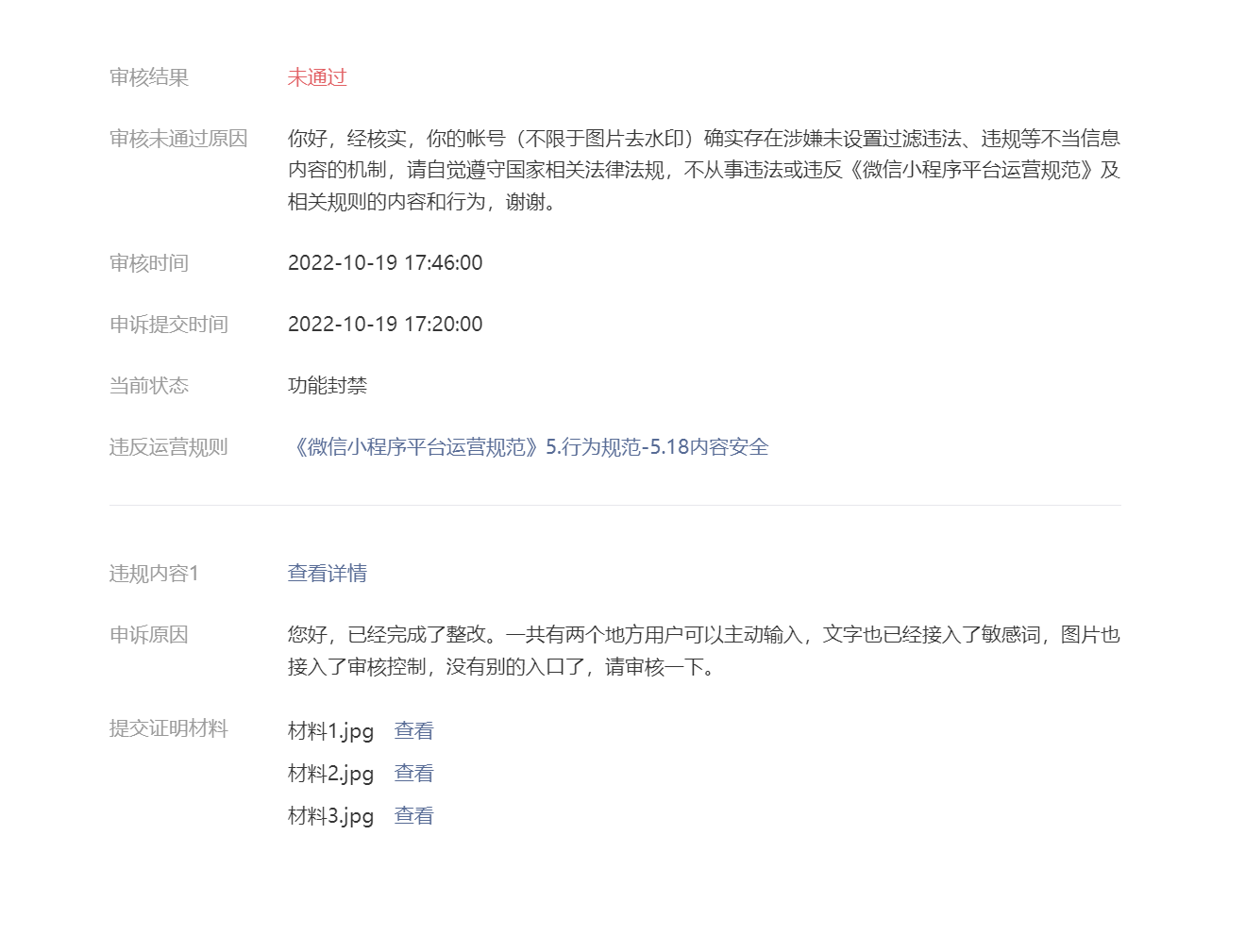 针对这个问题,我们已经删除了相关的内容与功能,并且全部接入了腾讯的文字与图片审核接口,我们用那个违规的图片测试了几十次了,没有问题,为什么我每次审核都给我拒绝呢 请相关人员帮我们看一下,十分着急