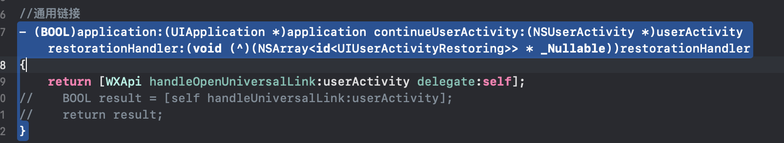 4. 因为考虑兼容旧版本微信,因此无论Scheme或Universal Links回调都必须处理。 在重写回调方法后,需要分别调用WXApi的handleOpenUrl和handleOpenUniversalLink方法