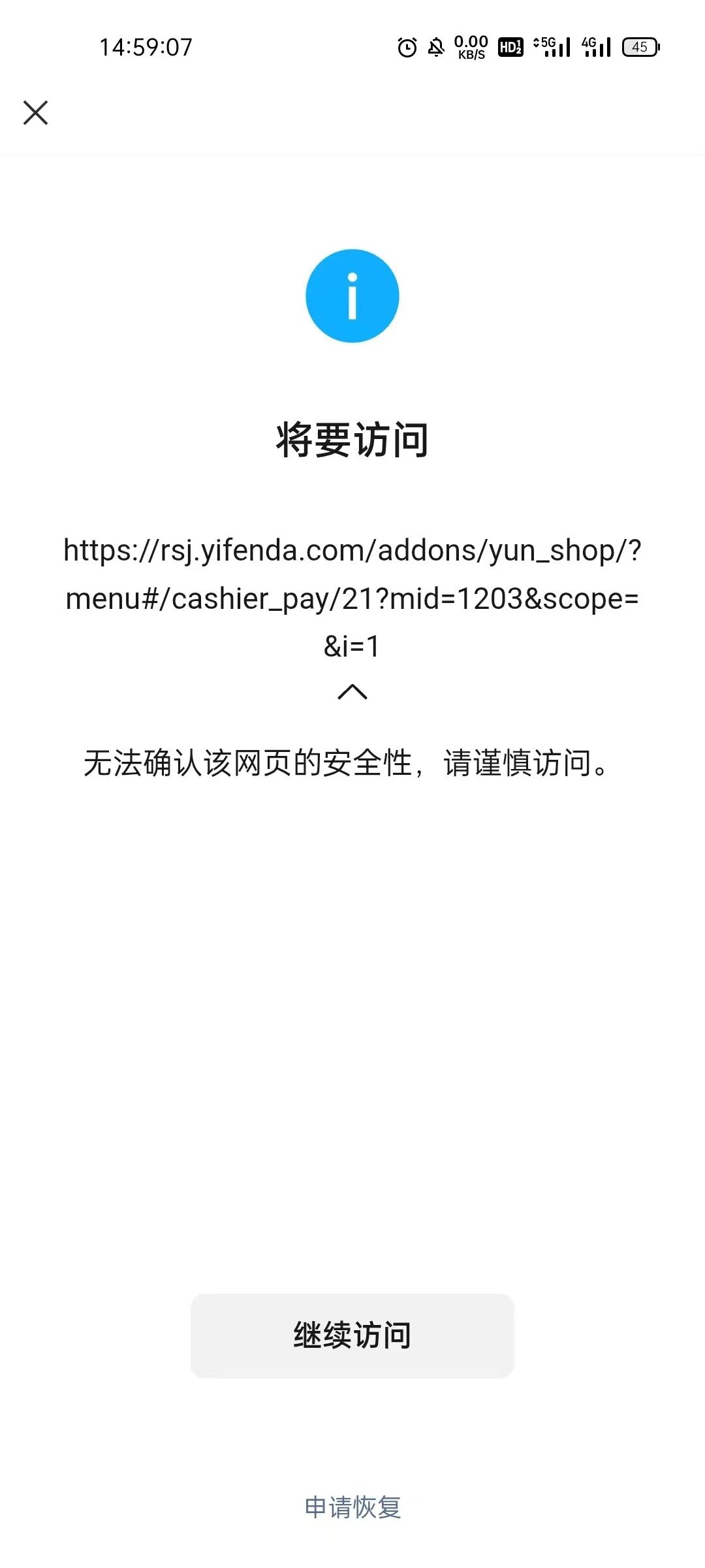您好,域名https://s.sanhaolvye.com/d?id=59049275&s=500在腾讯云注册并备案通过,服务器也在腾讯云,浏览器访问正常,我是网站开发者,访问时间如图2024/12/12,微信访问网站出现“无法确认该网页的安全性,请谨慎访问”,经检查网页里没有不安全的内容,请核实后帮忙解除拦截,谢谢!
