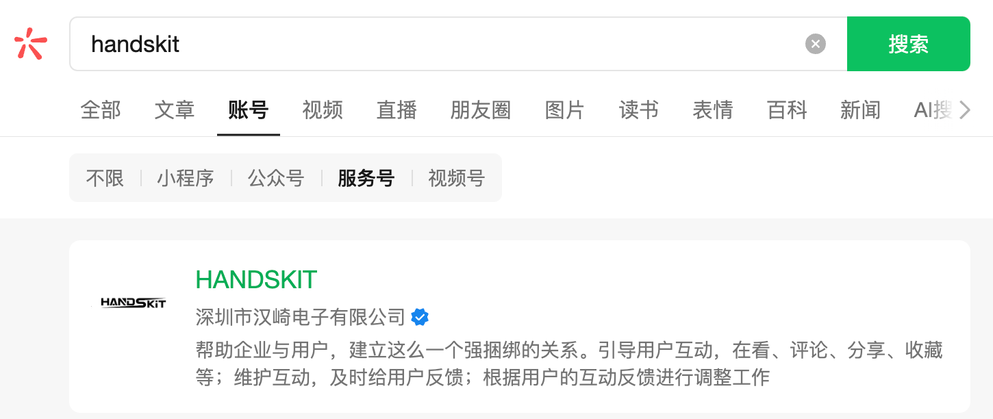 我在手机上搜索我的品牌 ,handskit 只有服务号, 没有搜索到公众号