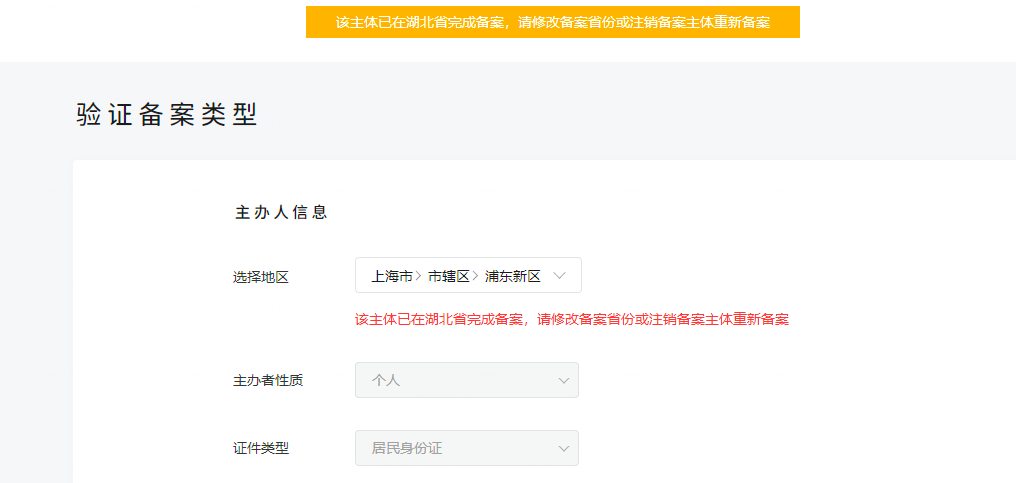 同主体只能在一个省备案。你要登录你其他备案的小程序或者域名,注销所有备案信息,才能在上海提交备案,或者修改在湖北备案也行。