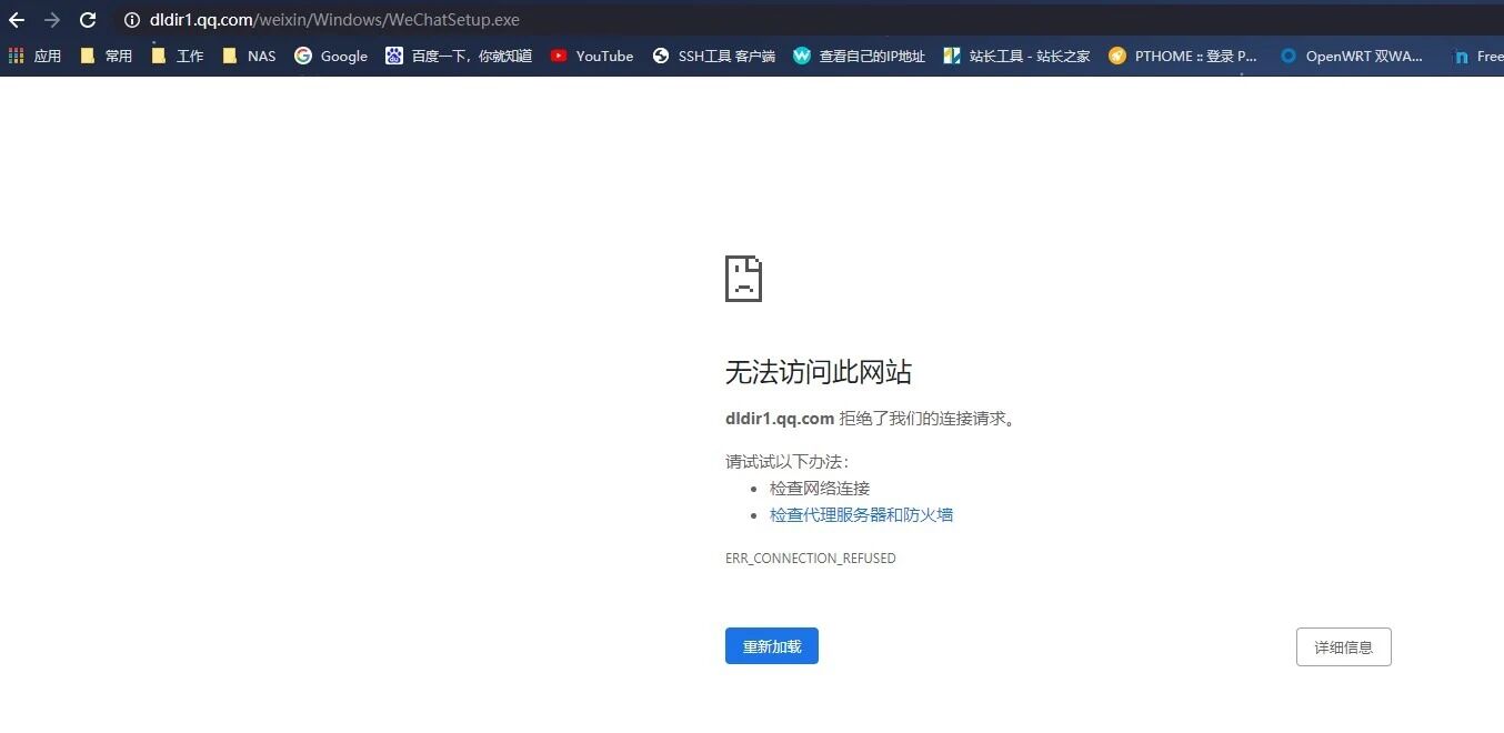 去网页下载新版的微信,点击下载后打不开,提示无法访问