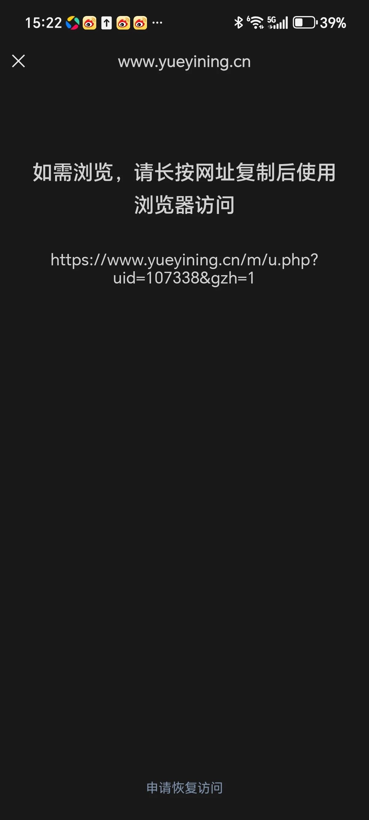 您好,是微信里打开网站,及公众号里的资料到服务网址http://www.yueyining.cn被拦截,网站在浏览器打开是正常的,但是微信里打开会拦截。的跳转不正常,跳转不了了