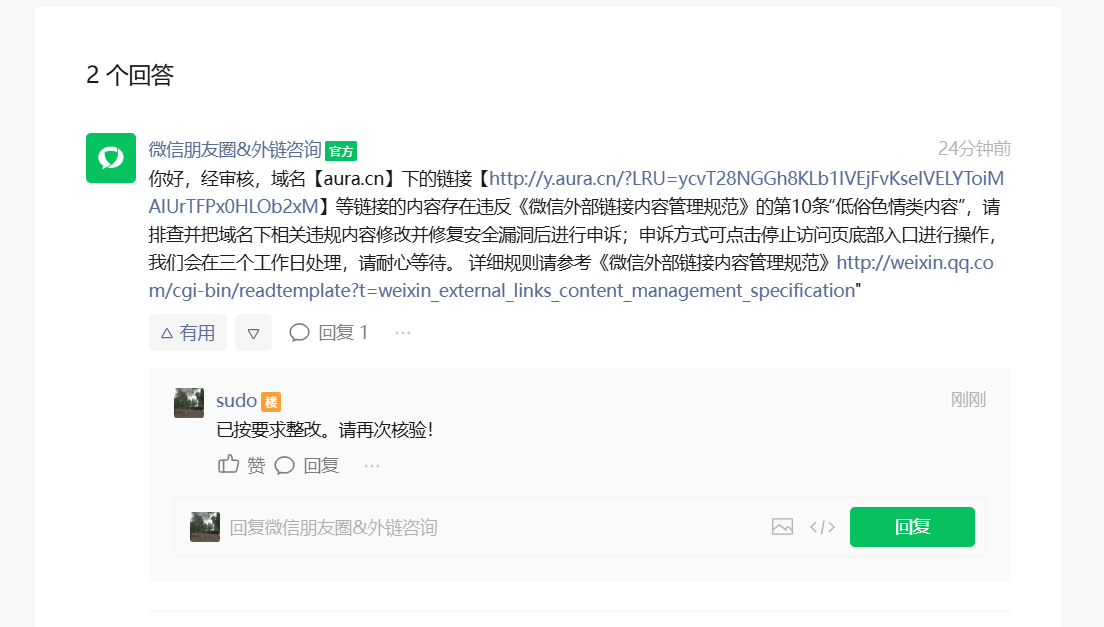 我司已按要求进行了整改,我司已不用 y.aura.cn域名,并停止访问服务器的内容(该服务器已不归我司所有和负责)。何时能恢复 我司网址aura.cn的在微信内的直接方式?