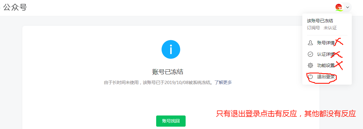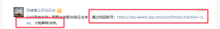 公众号被冻结:需要主体配合验证主体,通过找回账号:https://mp.weixin.qq.com/acct/findacct?action=scan,才能解除冻结。