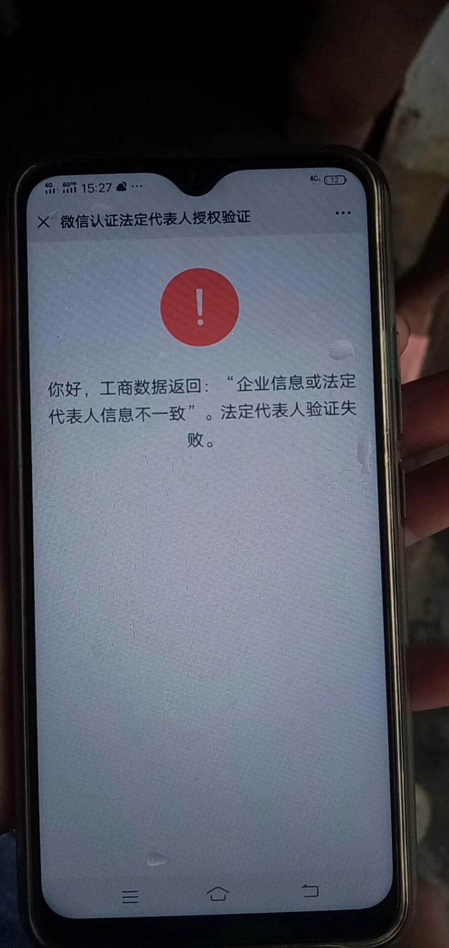 微信账号:gh_e0528d6c82b3 法人微信号:13907958037 在做法人扫码认证时,提示:你好,法定代表人身份证号码,工商数据未更新,请5-15个工作日之后尝试,法定代表人验证失败。 经过确认,此营业执照在申请时法人信息就未变化过,请官方尽快给予解决,谢谢!