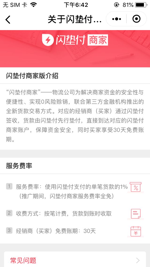 闪垫付商家是我司提供给物流公司发货人的销售政策管理工具,其中并没有任何金融产品申请功能,我们也不向这些发货人提供金融服务,还请明察。