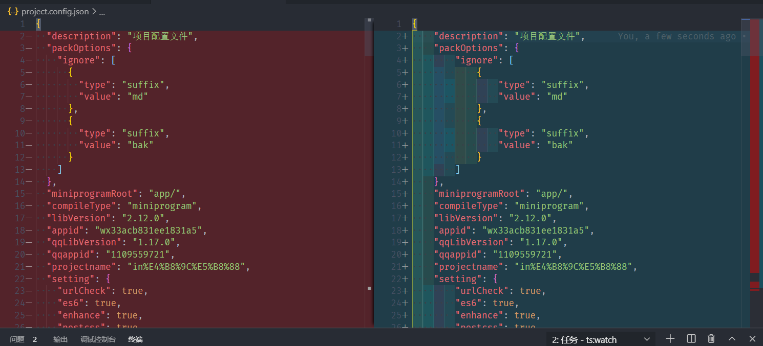原来 project.config.json 是以2个空格缩进的,然后在工具里添加编译模式,project.config.json 会变成以 tab 缩进的