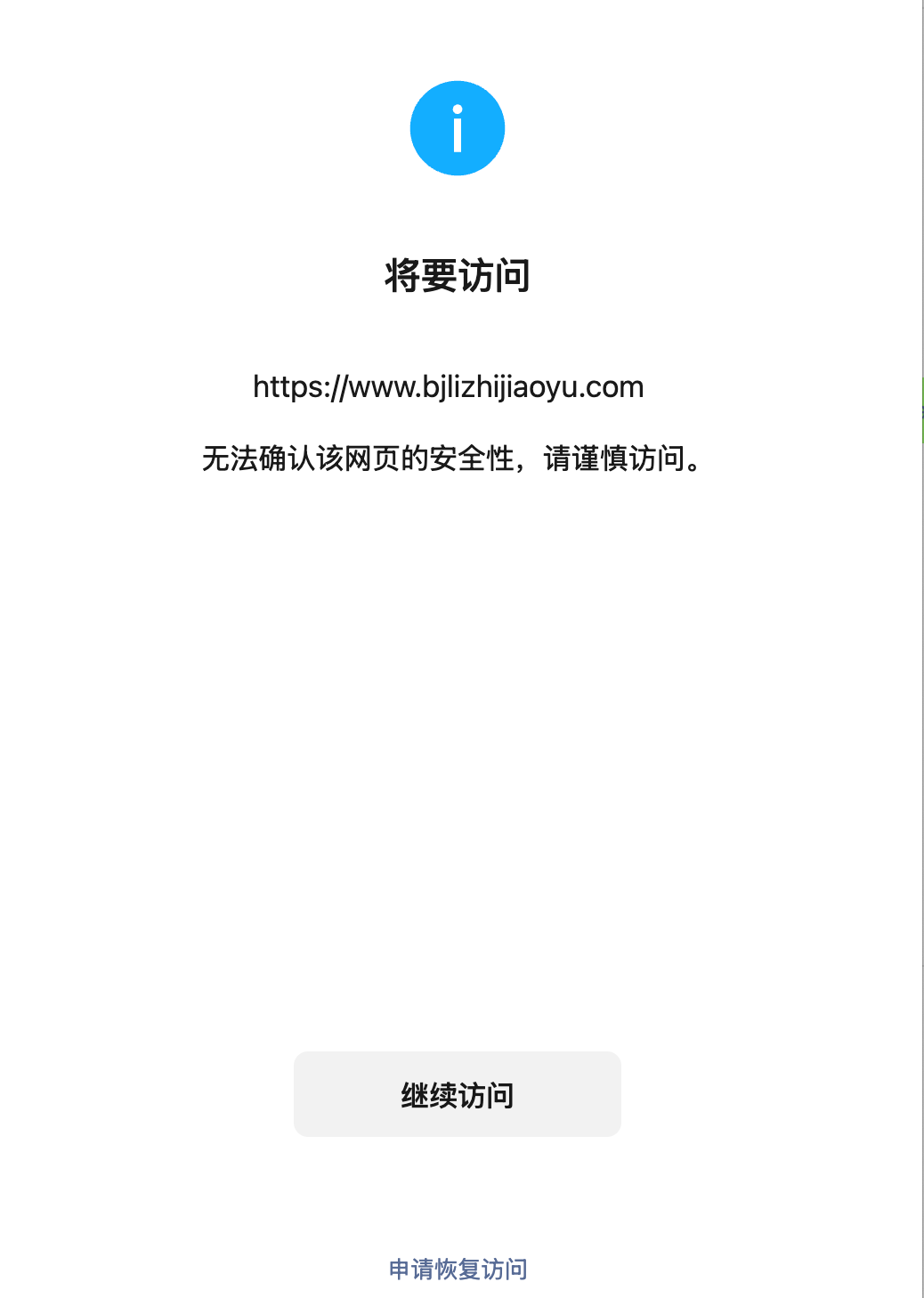 https://www.bjlizhijiaoyu.com/,域名并未违规,但是在微信内无法直接访问,需要能恢复直接访问