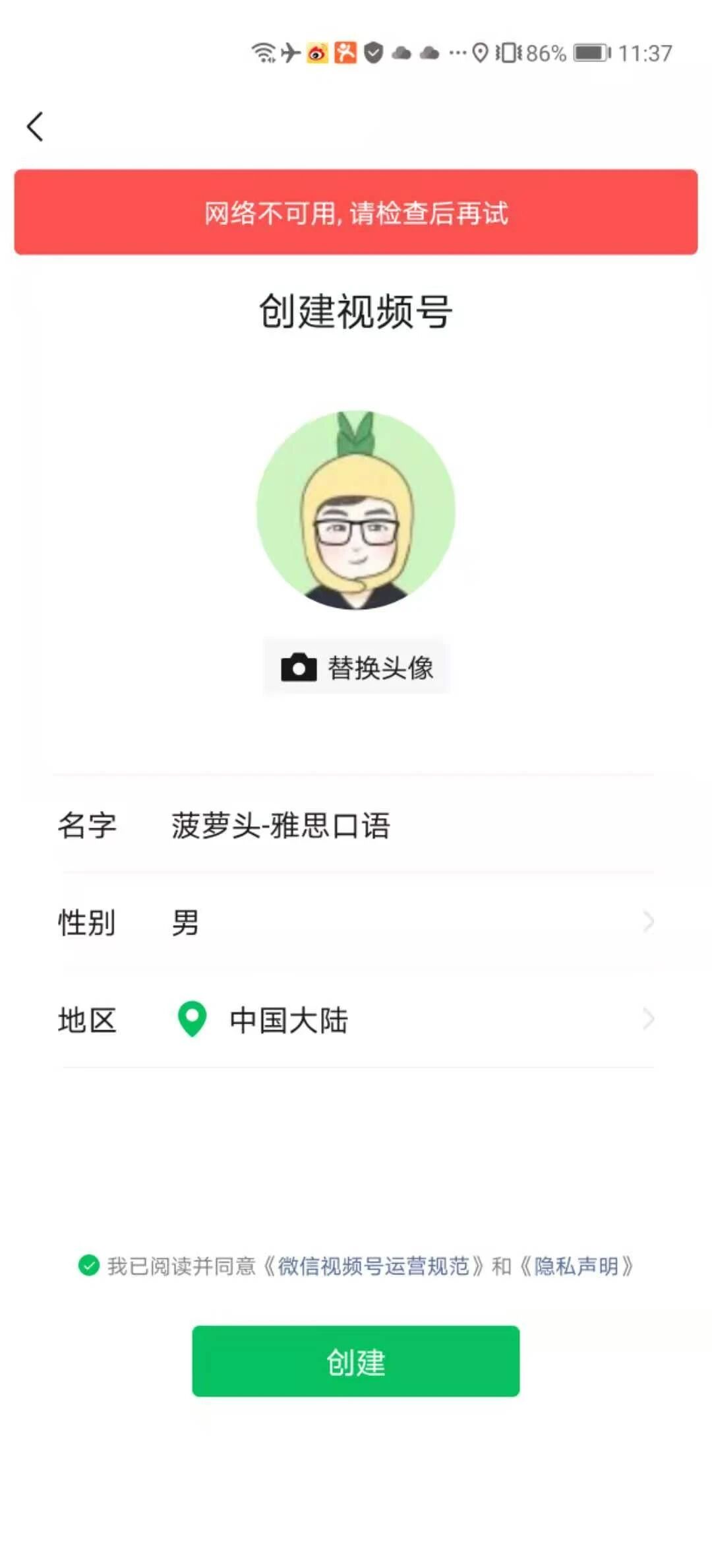 朋友发视频,选中视频,提示视频号可发60秒视频,点击,编辑内容,发送,之前没有创建过视频号要重新创建,填写名字,然后就提示网络不可用