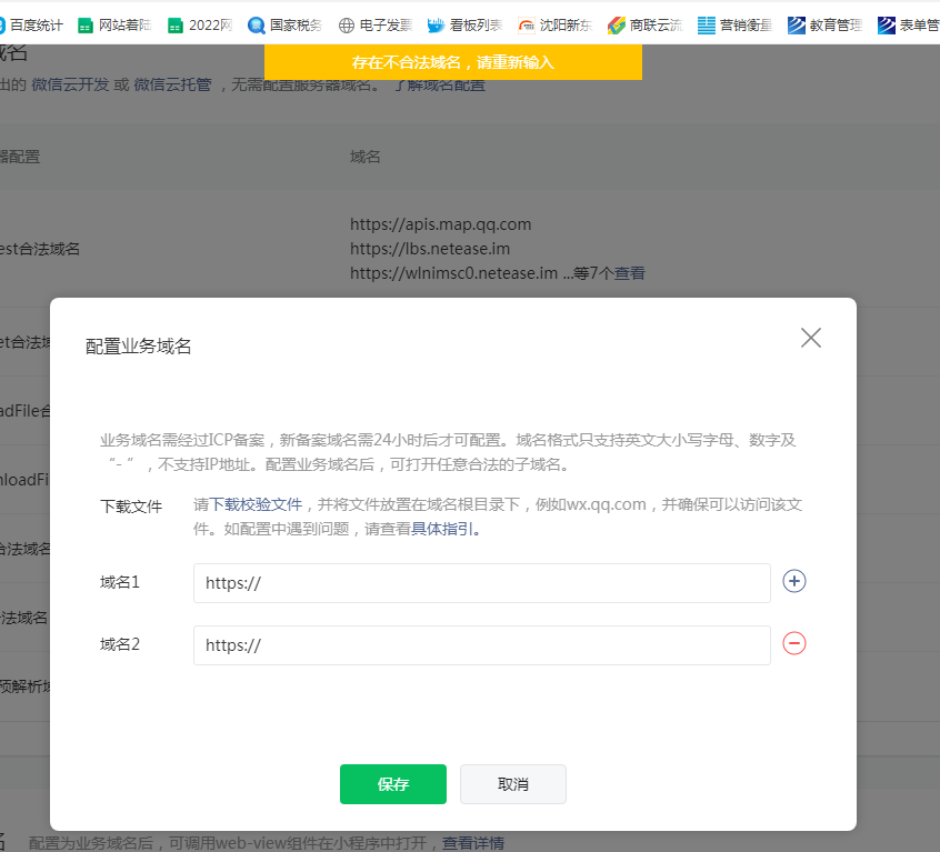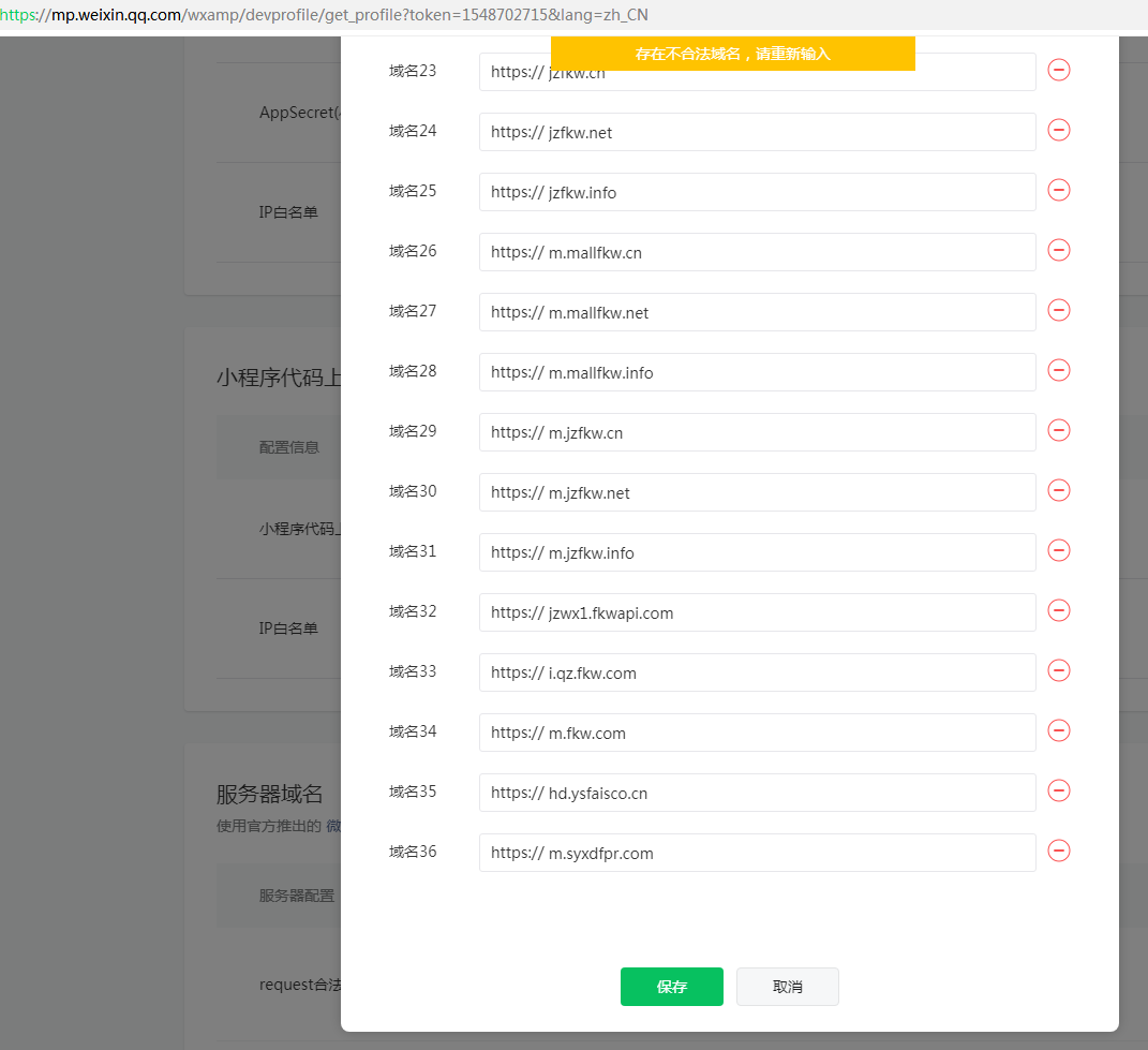 不是提示了吗,存在不合法域名;先试新增一个域名,看看不会不会提示不合法