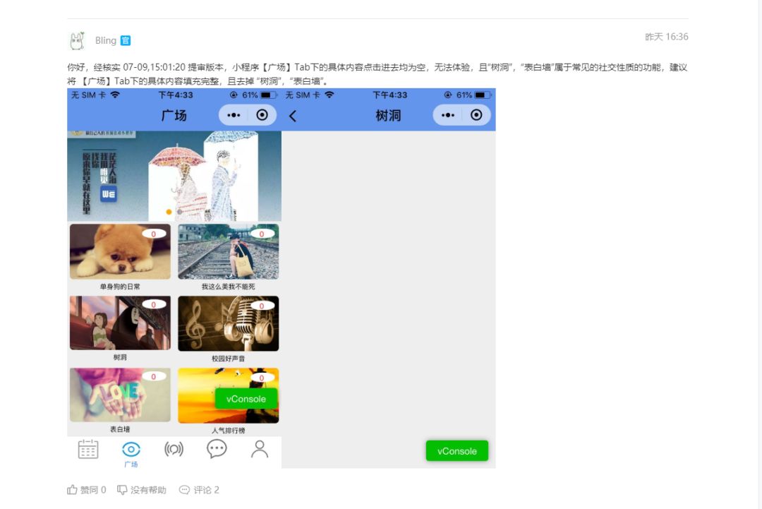 还有昨天您回复说广场Tab下涉及资讯,但是我怎么也看不出涉及资讯了,我问了身边十几个同学朋友,没有一个人为这是跟资讯相关的,不知道您那边是怎么定义的,开发者玩不了文字游戏!!而且我仔细研究了个人类目要求,是允许照片文字以及音频的发布展示的。我广场Tab下面的几个板块都是跟图片文字音频相关的,所以不存在涉及到个人不允许的服务类目。就是单纯的分享生活感悟,生活点滴照片以及歌曲的,我怎么也搞不懂这会是资讯相关。而且你们平台个人服务类目里面允许了,这边审核又不给通过,这不是矛盾吗?而且我也是参考已上线的小程序“皮克秀PicShow”这一类的小程序,他们都能直接审核通过,为什么单单卡我卡了半个月,改了10次了!求给个电话解释,或者再给仔细审核下,您可以对比下已经上线的这些小程序,想要一样的公平对待。非常感谢,电话已经留给您了,希望你能给打个电话解释下。是在没有其他办法联系你们了,只能每天在这发一个帖子。非常感谢,感激不尽,祝您生活愉快~这是您之前让我改的要求,我改过之后,昨天审核又没给通过,这样反复不是一次两次了,所以我才比较没有办法,只能求您给个电话说法了,我又不是没改!求电话联系。非常感谢