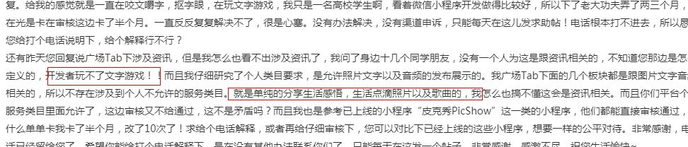 现在只求您给我打个电话详细说明下,电话联系方式已经留给您了,在社区回复或者我的小程序的广场Tab下第一个板块里面。或者我们明确好到底要怎么改,怎么样您那边才会给通过。您看记录也能看得到,我已经改了很多次了,每次都是按照您说的那些不符合,我改了后又给打回,说其他原因,一直这样反反复复。给我的感觉就是一直在咬文嚼字,抠字眼,在玩文字游戏,我只是一名高校学生啊,看着微信小程序开发做得比较好,所以下了老大功夫弄了两三个月,现在光是卡在审核这边卡了半个月。一直反反复复解决不了,很是心塞。没有办法解决,没有渠道申诉,只能每天在这儿发求助帖!电话根本打不进去,所以恳求您给打个电话说明下,给个解释行不行?