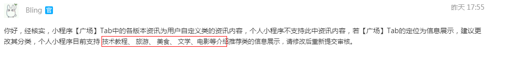 刚才又给审核不通过,然后原因又变了,和您昨天说的又变得不一样了~ 现在回复说:小程序服务提供的内容涉及发布传播信息,属个人未开放类目,建议选择企业主体小程序。
