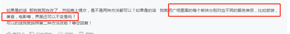 如果是的话 那我就现在改了,然后晚上提交,是不是两种方法都可以?如果是的话 我就把广场里面的每个板块分别对应不同的服务类目,比如旅游,美食,电影等,界面还可以不变是吗?