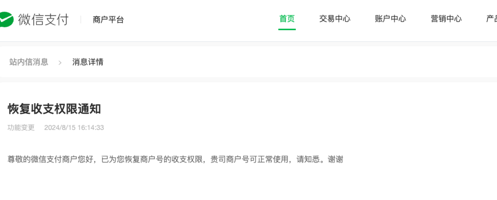 收到了这个报错,但其实商户号的收款功能恢复正常了,并没有被限制,请问大佬们有没有遇到过这种问题,如何解决?寻找客服一直都是机器人答复,没有有效信息反馈。谢谢。