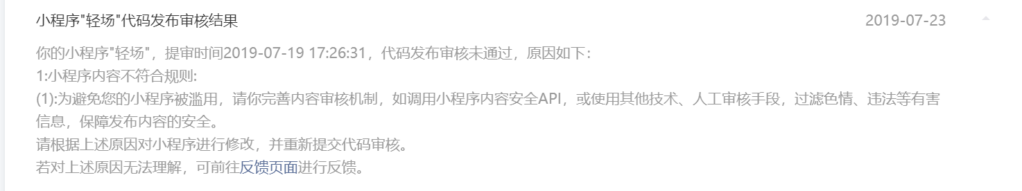 微信的审核组,你们好,在小程序第一次因为此原因被拒后,技术工程师已经已经加了 内容安全api,并重新提审。