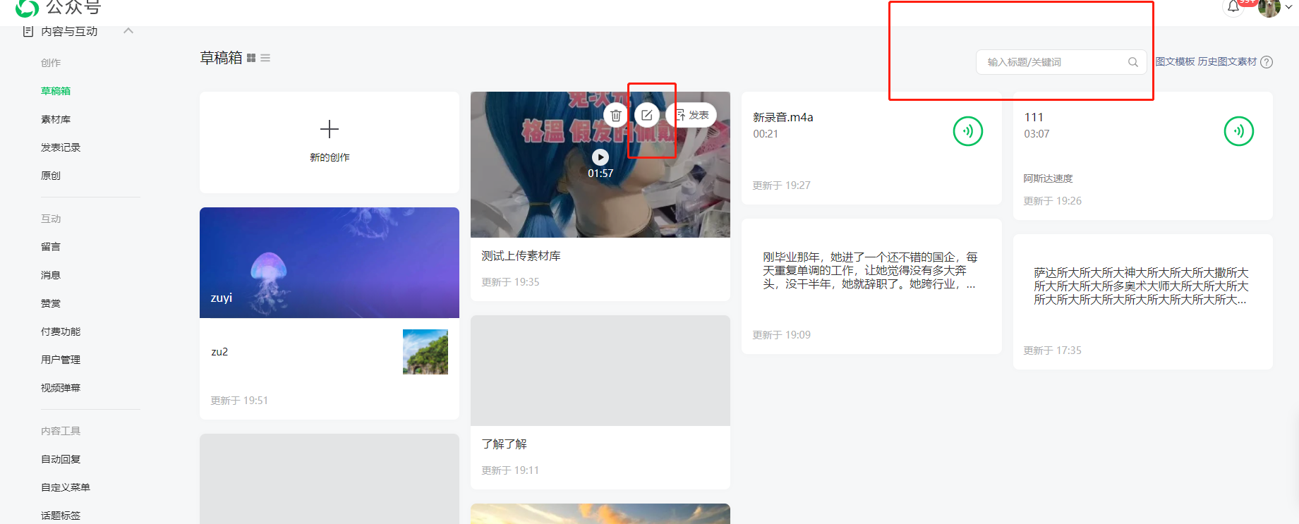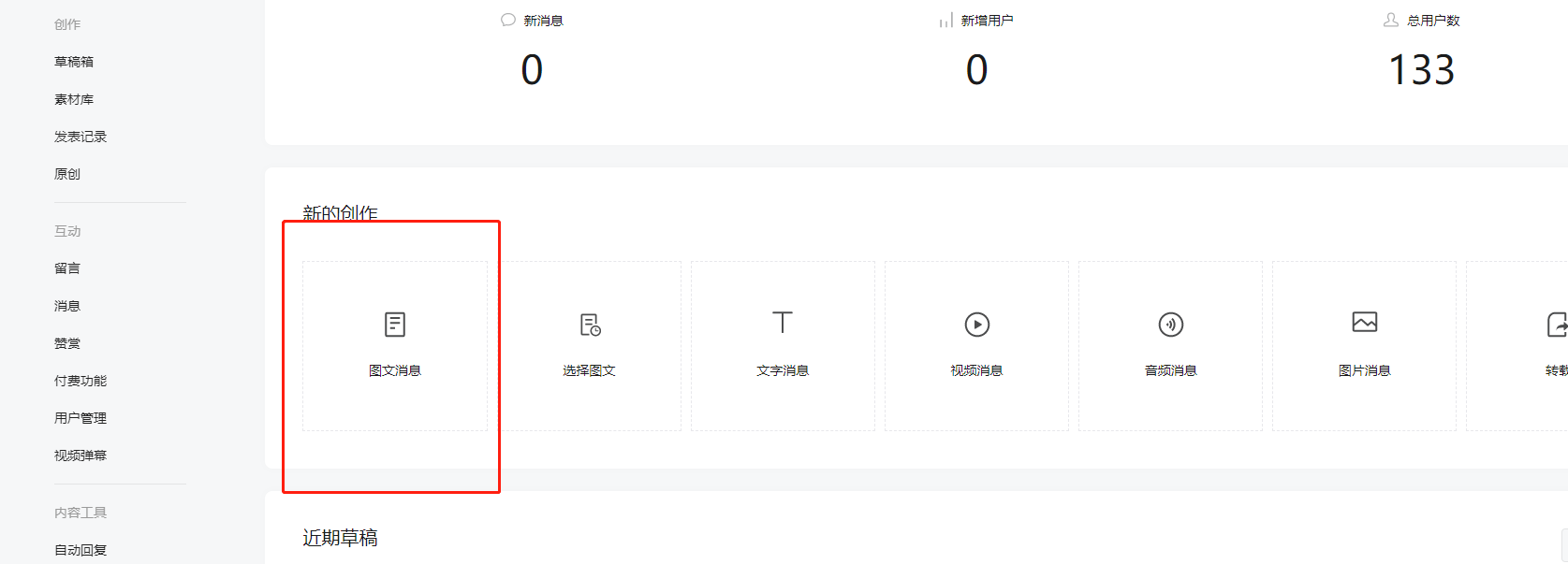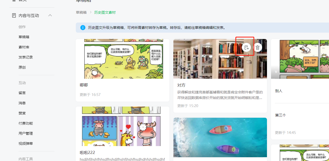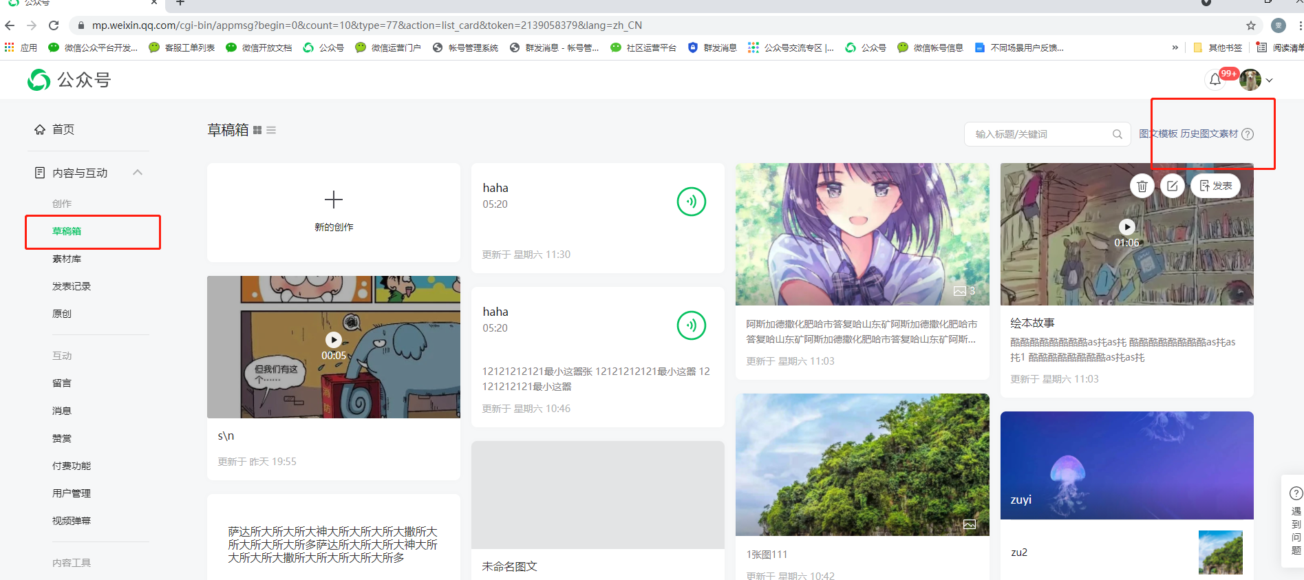 如果需要修改之前的素材,则需要到草稿箱—历史图文素材中转存以后再次编辑修改。过后直接在草稿箱中编辑即可。