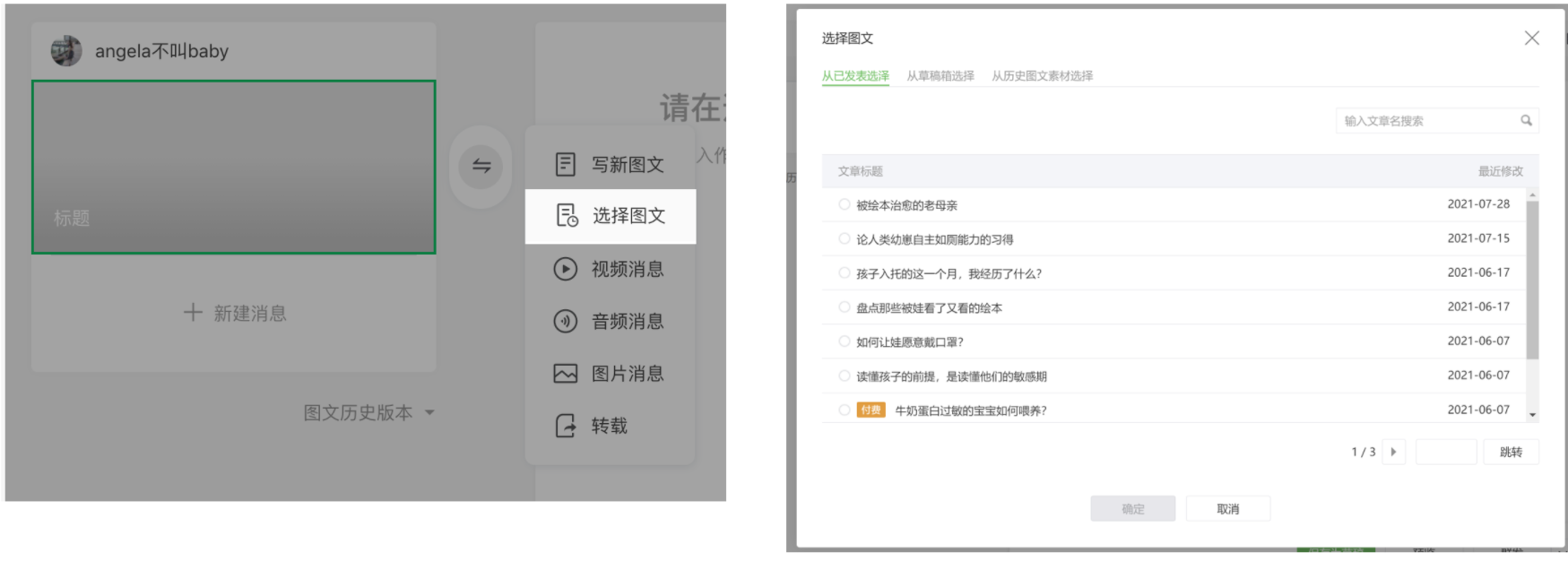 1.首页——图文消息—选择图文(可搜索选择对应图文)