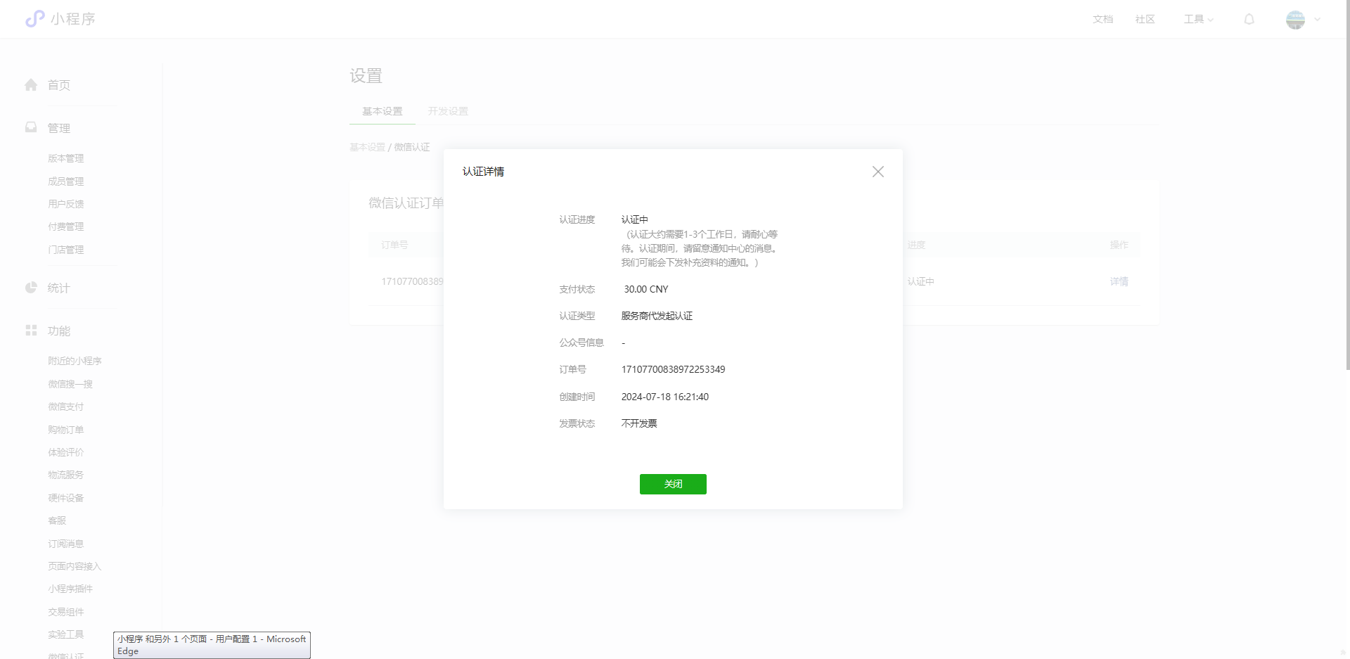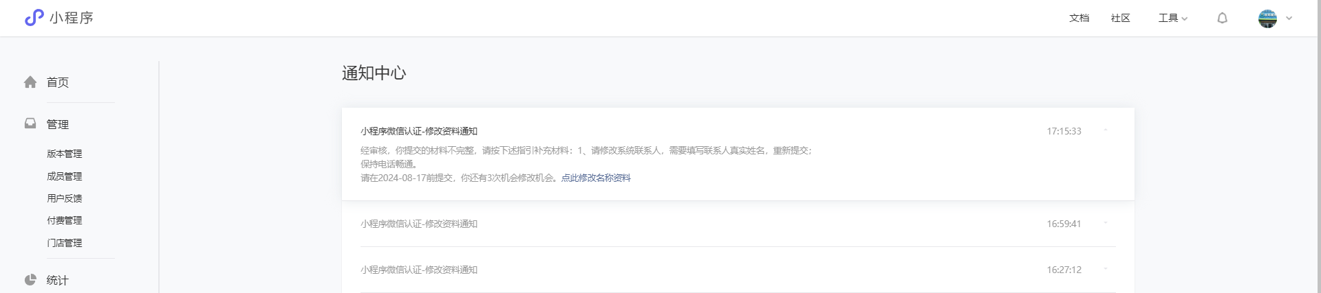 小程序认证时把联系人名称写成了公司名称,审核人员打电话说让去后台修改一下。我进后台的通知中心看到修改资料的通知,点击“点此修改名称资料”后,没有跳转到修改资料的界面。而是跳转到了微信认证订单页面,认证状态显示“认证中”。我联系了审核机构,他们说已经给驳回了(驳回后认证状态还是认证中),请问这种情况怎么处理,谢谢!