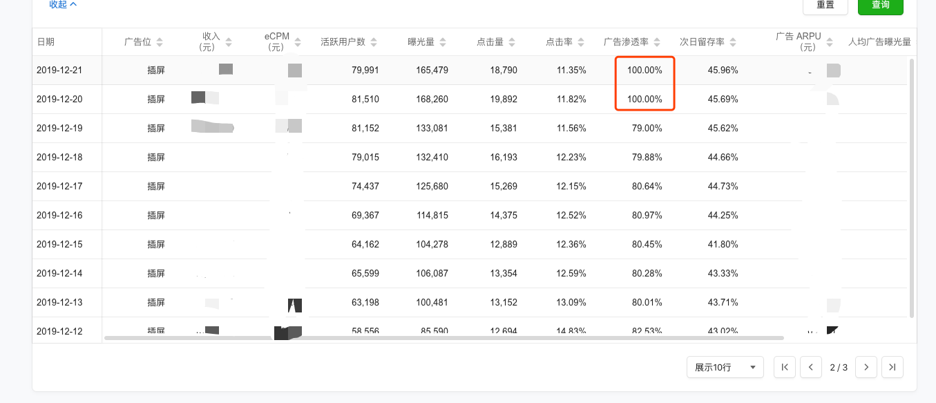 数据报表中的广告渗透率数据从2019-12-20开始变得异常