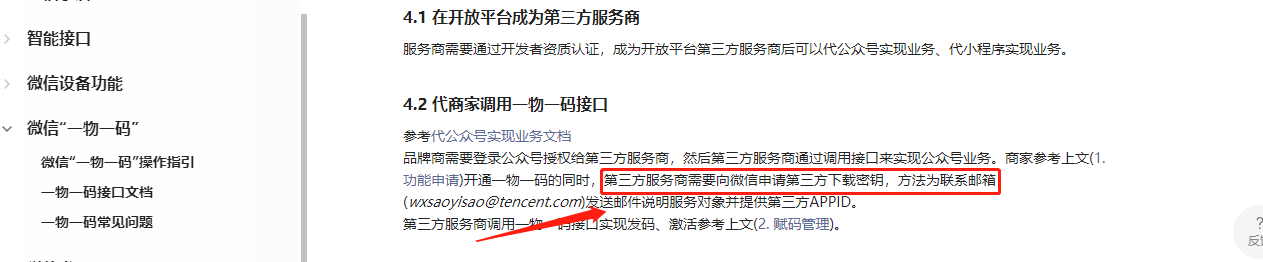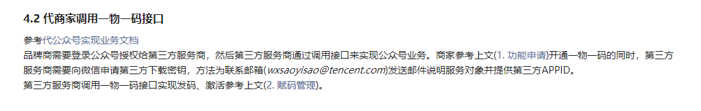 你好,根据文档https://developers.weixin.qq.com/doc/offiaccount/Unique_Item_Code/Unique_Item_Code_Op_Guide.html#11发送邮件内容说明服务对象、提供第三方APPID即可哦