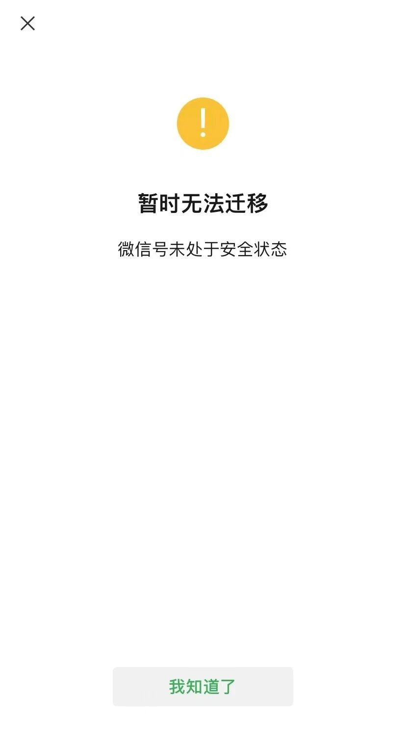 你好,我在视频号管理者迁移的过程中遇到问题,接收邀请时被提醒“暂时无法迁移,微信号未处于安全状态”。