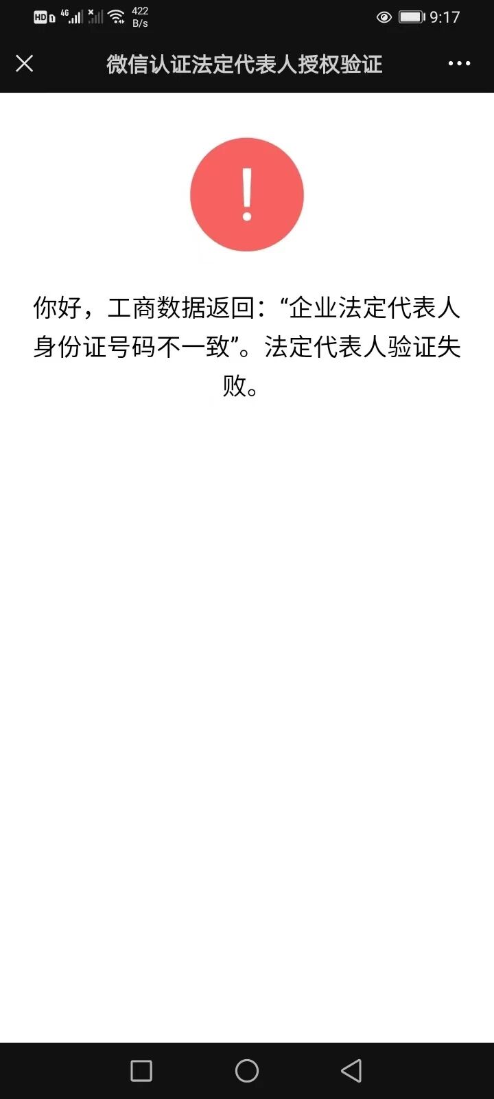 我是2023年2月28日注册下来的个体户营业执照,等了18天了,为什么微信认证公众号,一直显示我企业法定代表人身份证不一致,法人扫脸验证失败,,,和朋友一起创业,,,现在遇到了这个问题,一直卡在这里,微信人工客户一直解决不了,,请各位大神帮忙想一下办法,,,大恩不言谢