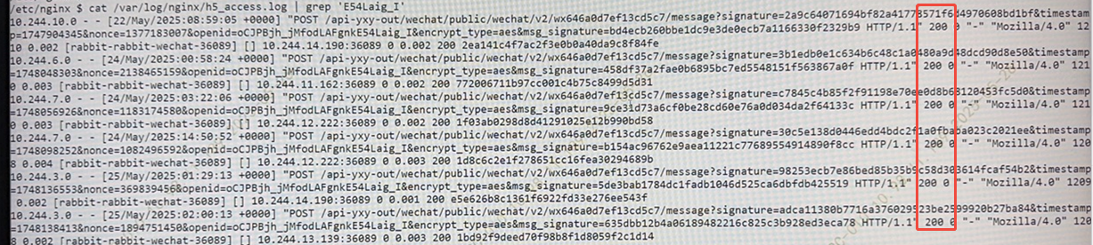 错误样例: [OpenID=oCJPBjtsc8Oj_R-nMQM8XT3b_eC0][Stamp=1747725426][OuterIP=][3rdUrl=https://pspmk.shrcb.com/api-yxy-out/wechat/public/wechat/v2/wx646a0d7ef13cd5c7/message][IP=101.230.90.201][MsgType=20000][Event=Template Send Job Finish][http code=502]