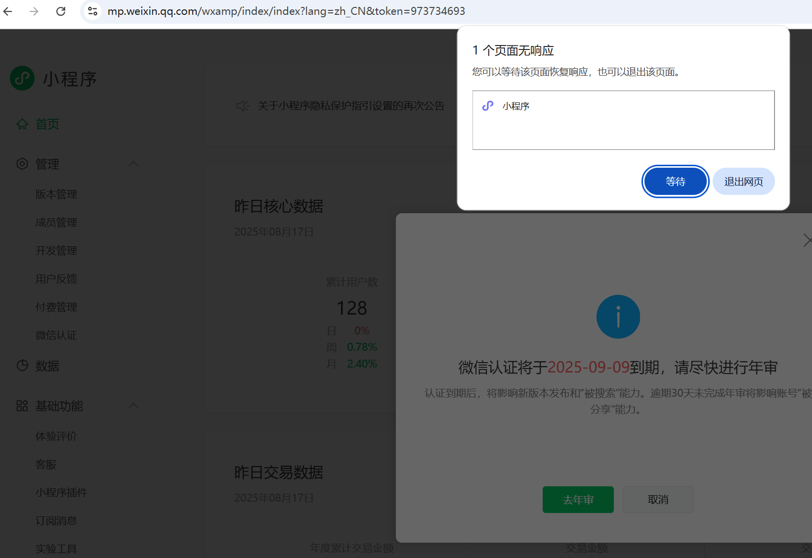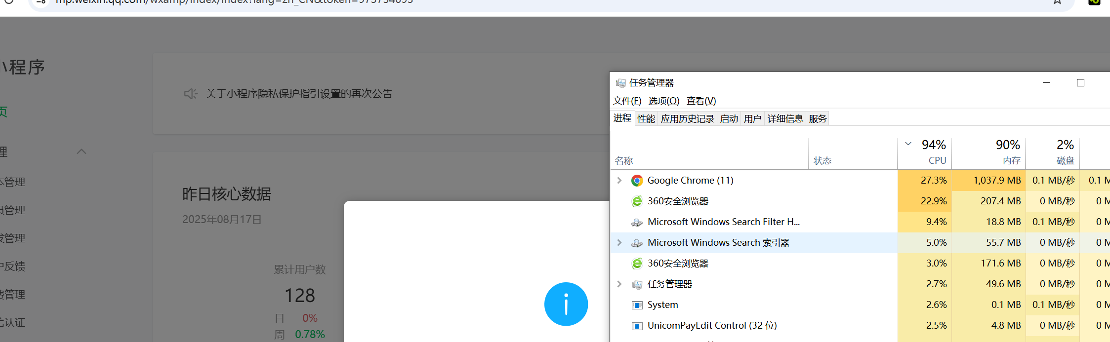 小程序后台登录页面长时间处于无响应状态。换浏览器也不行。任务管理器中看到浏览器占用CPU极高。偶尔刷新又能正常访问。
